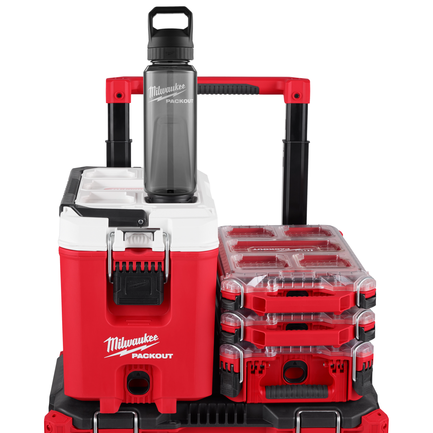 Our PACKOUT™ Bottles with Chug Lid features twist-to-lock PACKOUT™ Connectivity so you can attach your bottle to the top of PACKOUT™ solutions, allowing for secure drink storage on the jobsite. Each bottle comes with a leakproof chug lid to prevent spills while transporting PACKOUT™, and dishwasher safe for easy cleaning. The impact-resistant body is built and engineered to withstand the harshest jobsite environments. MILWAUKEE® PACKOUT™ is the industry's most versatile and durable modular storage system.
