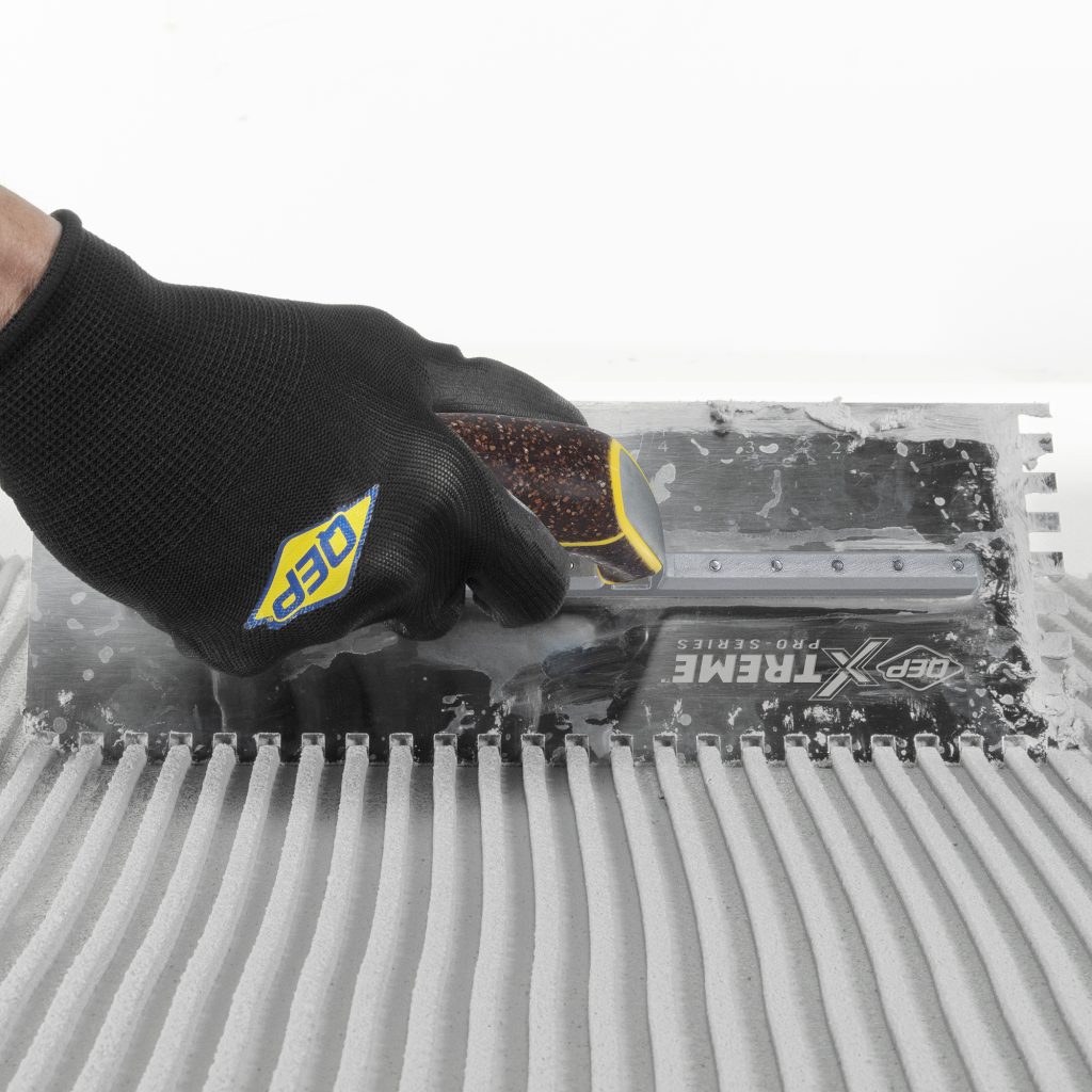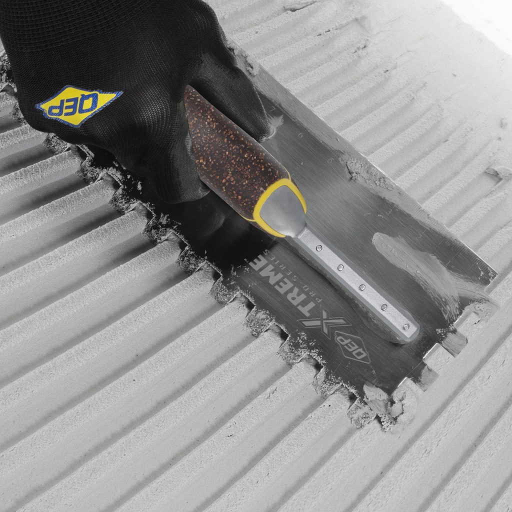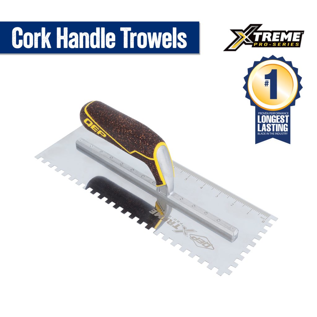 The QEP Cork Handle XL Trowel features a cork infused handle, engineered for better cushion and anti-slip use and a built in ruler on the smooth edge. The more this trowel is used, the more cork becomes exposed, improving the non-slip properties of the handle. The extra handle-to-shank distance allows for maximum hand clearance and added comfort. Use this trowel to easily apply thinset on tile with the longest side less than 8".
