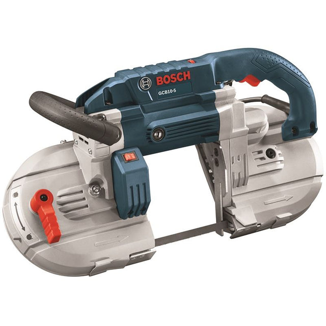 The Bosch GCB10-5 deep-cut band saw is the lightweight, easy-to-handle tool that delivers nearly spark-free cuts through rebar, conduit and other metals. This saw features a robust 10 Amp motor that offers clean, precise cuts - with less rework needed for burrs or tempering colors. This tool is powerful enough to handle professional-sized jobs on most materials. And it provides nearly spark-free cuts for safer metal-cutting operation. With variable-speed settings from 100 surface feet per minute and up to 380 surface feet per minute, the band saw allows the user can match the cut rate to the material for greater precision. This ergonomic, compact band saw weighs only 14.5 Lbs., making it ideal for overhead cuts, and it has a saw hook to hang between cuts. It as a bright LED to illuminate the cut line.