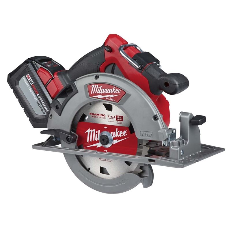 Designed for the carpenter, remodeler and general contractor the M18 FUEL 7-1/4 in. circular saw from Milwaukee generates the power of a 15 A corded saw, cuts faster than a 15 A corded saw and gives users up to 750 cuts per charge. The POWERSTATE brushless motor provides 5,800 RPM and higher speeds under load for corded cutting performance. REDLINK Plus intelligence ensures maximum performance and protection from overload, overheating and over discharge. The M18 REDLITHIUM HIGH OUTPUT HD12.0 battery delivers unmatched run-time in all applications. All magnesium guards and shoe delivers extreme durability for jobsite conditions. A built-in rafter hook offers quick and easy storage and an electric brake stops the blade quickly after cuts are complete for maximum productivity.