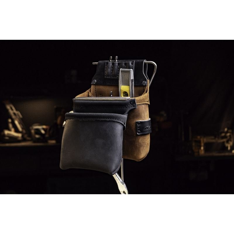 Streamlined left side bag intended for finishing or light framing with 1 outer bag. 4 slot high bit index, outer front punch loop, diagonal nail puller/flat bar sheath, 7in rafter square slot, outer rear auxiliary loop for clip-on accessories, 2 interior punch/long bit loops