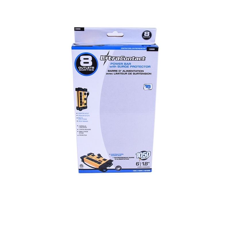 The Ultracontact Power Bar by Toolway is perfect for DIYers and contractors alike. It can handle up to 1050 joules, features a lighted on/off switch with built-in circuit breaker, 8 outlets, steel housing and a built-in cord storage design.