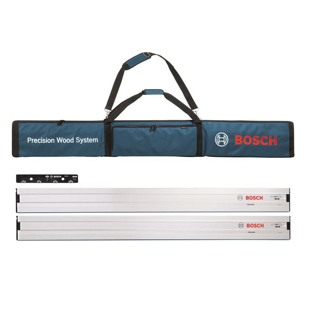 Convenient 63 In. Tracks and Connector Kit - collected to get started with the Bosch Track Saw (sold separately), featuring two FSN1600 63 In. (1600mm) tracks, an FSNVEL connector and a track bag