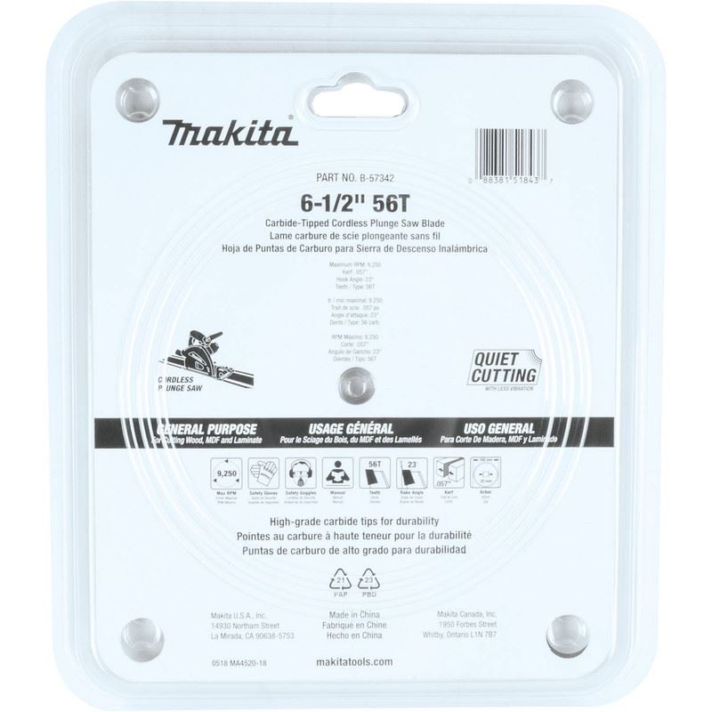 Makita B-57342 6-1/2in 56T Carbide Tipped Max Efficiency Cordless Plunge Saw Blade