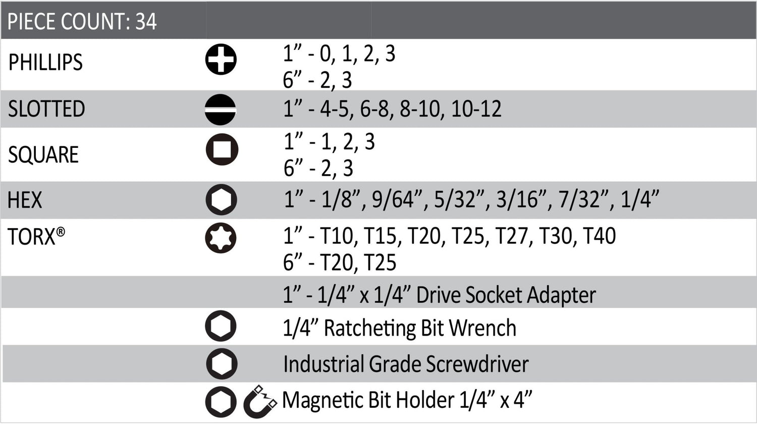 Includes industrial grade screwdriver.