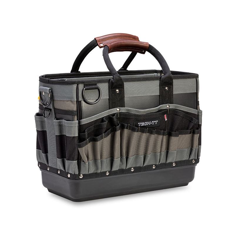 The TECH-TT provides two exterior shop walls of tool storage along with open access to all interior tool pockets keeping gear visible and accessible. Built on a waterproof plastic base the TECH-TT is designed for any tradesperson or technician to quickly store hand tools in vertical pockets as well as larger tools in the center bulk storage section of the bag. The two removable V SWAP pocket panels are included with your purchase and enable customizing the interior for creating more or less bulk storage capacity. You may purchase additional panels as you like to accommodate more arrangements. A tape measure, small driver or Veto pouch can attach to the stainless mounting clip