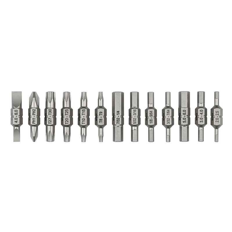 Ultra Compact, Ultra Lightweight, Ultra Convenient. Saves Time, Fewer Tools to Carry, Less Weight 26 Tips. 13 Premium double-ended bits. Ergonomic Soft Grip Handle, Locking bit holderThis is how Wiha does multi-bit screwdrivers. The Ultra Driver 26inOne. 26 Bit Tips, Quick access, the right bit for the job. Comfortable Cushion Grip Ergonomic Handle Spring driven pop up cartridge for fast bit selectionHigh Performance Quick Release Locking Bit Holder Hardened and Tempered CVM Tool Steel Bits Precision machined for an exact fit. All the drivers you need when and where you need them. Grab and Go Convenience Industrial Tip Sizes Included TORX: T8, T9, T10, T15, T20, T25, T27, T30 Phillips: , #1, #2, Slotted: 4.0, 6.0 Metric Hex: 2.0, 2.5, 3.0, 4.0, 5.0, 6.0mm Inch Hex 3/32, 7/64, 1/8in, 9/64, 5/32, 3/16, 7/32, 1/4in