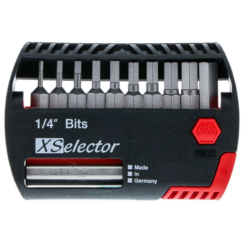 Hex Inch 1/16, 5/64, 3/32, 7/64, 1/8, 9/64, 5/32, 3/16, 7/32, 1/4in Insert Bits, Quick Release Holder in XSelector Storage BoxBits: Hex Inch 1/16, 5/64, 3/32, 7/64, 1/8, 9/64, 5/32, 3/16, 7/32, 1/4in Wiha premium bits - exact fit precision machined Universal fit for all standard bit holders & power tools Wiha special chrome-vanadium-molybdenum tool steel Precision machine chamfered ends No cut off burrs or impact distortions Through hardened for best wear resistance Magnetic Quick Release Bit Holder Narrow Profile Case Tip out drawer holds ten bits, Bits always visible opened or closed Box made of High Quality Plastic The simplest bit removal guaranteed