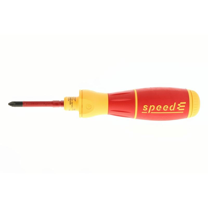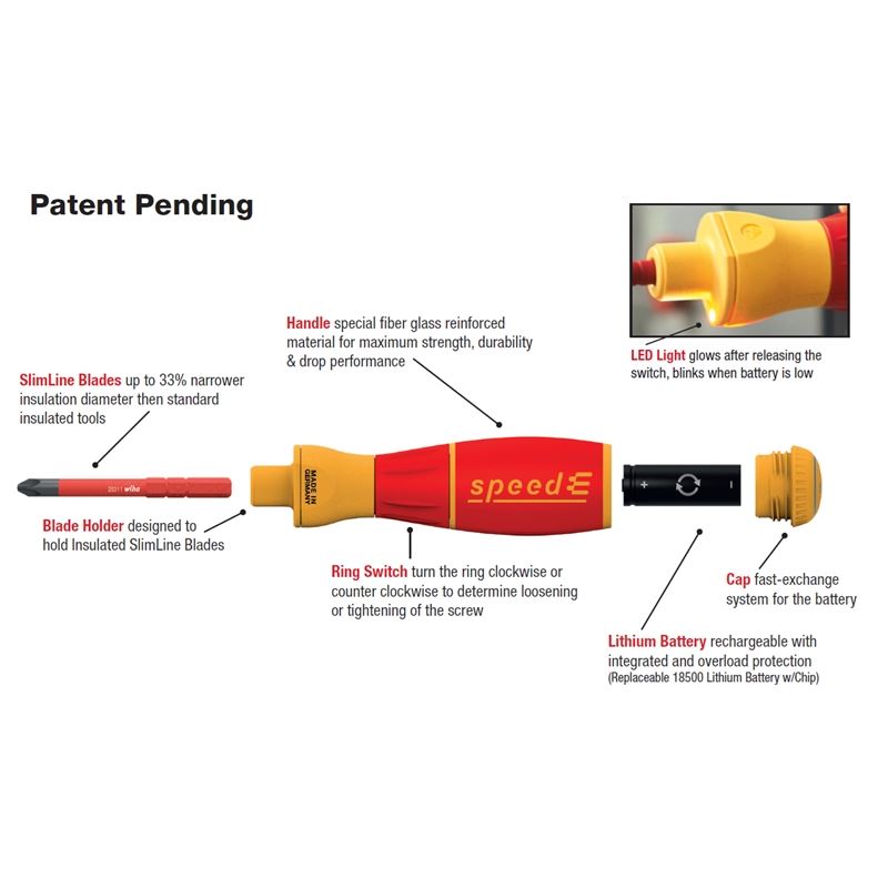 SpeedE Electric SlimLine Blade Set, 13 Piece. Set includes: SpeedE electric handle 0.4 Nm, 8 SlimLine Blades Slotted: 3.5, 5.5mm, Phillips #1, #2, Square: #1, #2, Terminal Xeno Sl/Ph: #1, #2, Adapter Plug, Battery charger & 2 Replaceable Batteries in Storage Box.SpeedE Handle Protects your material Electric fastening with a protective function to prevent damage to materials (max. 0.4 Nm = 3.5 in/lbs.) Increases your control Fixing by hand withfull sensitivity Increases your efficiency Electronic ratchet for rapid fastening without any re-gripping Increases your efficiency 100% compatible with the Wiha slimLine blade system Maximum freedom of choice Open system with a rechargeable standard battery Offers you full protection slimLine blades tested at 10,000 V AC & approved for 1,000 V AC Storage Box L-Boxx mini storage solution for tradesmen and service professional that are always on the move. Perfect for holding the speedE screwdriver and all the speedE accessories. Insulated SlimLine Blades 1000 Volt Rated, 10,000 Volt Tested Meet ASTM , IEC, VDE, EN, ISO, NFPA SlimLine Blades, 33% narrower insulation diameter then standard insulated tools Adapter Plug 110 Volt adapter wall plug included. Easy to use and practical for traveling. Battery Charger & Batteries Li-Ion battery charges off USB power source. The charger level indicator will light up red when batteries are charging and then green when the batteries are fully charged.13 Piece Set