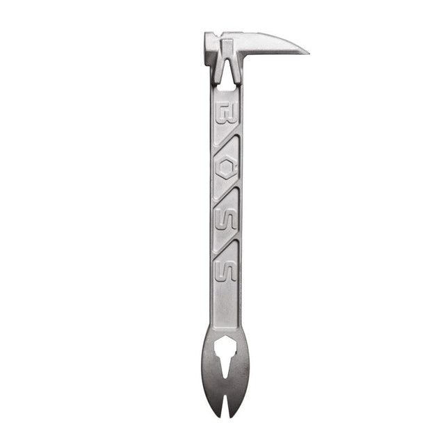 The ultimate addition to your toolbelt. The Boss Paw is an essential tool for the professional carpenter. Made out of Titanium to be lightweight and more durable than steel. The Boss Paw was designed with multiple functions to meet the needs of today's carpenter. The Boss Paw also allows you to hook a nail head from 4 different locations at multiple angles to keep the job going. Featuring a striking face with built-in magnetic nail starter that allows you to start finish nails in tight spaces. You can also use the striking face to get under buried nail heads. Incorporated 13mm hex wrench. Made in USA.