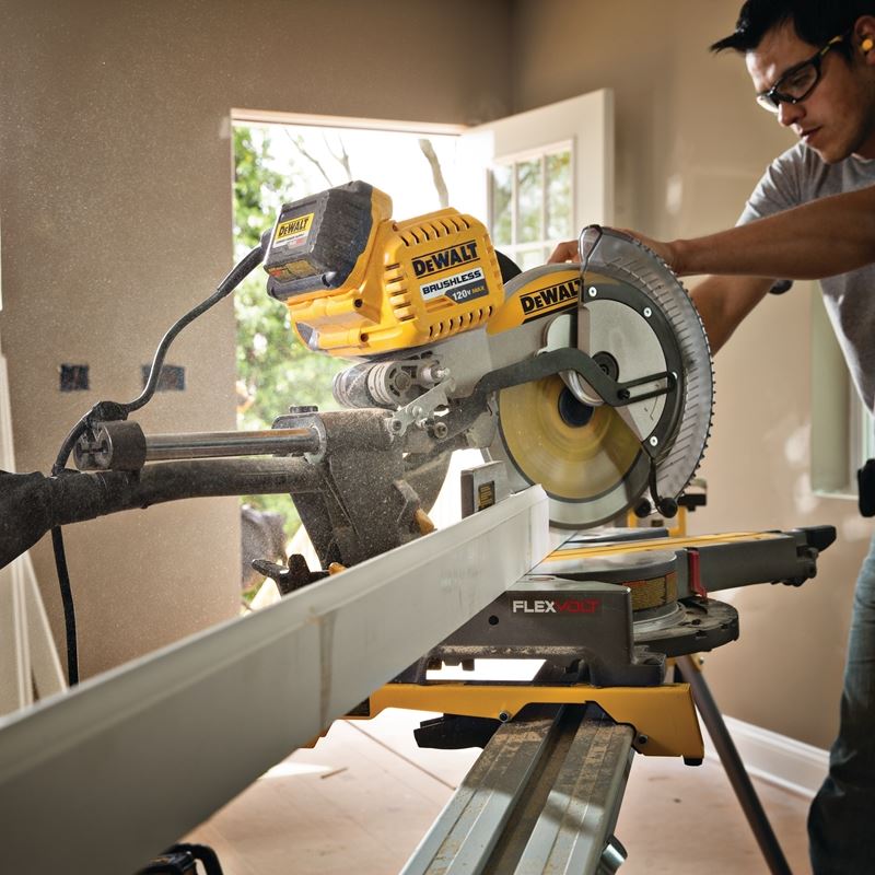 The FLEXVOLT 12 in. 120V MAX Double Bevel Sliding Compound Miter Saw that delivers the Capacity, Accuracy, Power, Ease of Use, and Durability of a corded tool with the portability and convenience of a cordless tool. The kit includes the 120V AC adaptor. Batteries and dual port fast charger sold separately.
