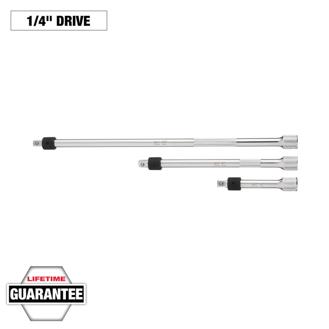 Our 3PC 1/4" Drive Locking Extension Set offers the most control and is more secure in tight applications. These extensions feature the largest knurling surface on both the shaft and female drive end allowing precision control when hand-tightening fasteners or working with oily materials. In addition to keeping the socket secure with a durable knurled locking collar, these extensions feature a detent hole to increase engagement with the ratchet head for better overall retention. The set includes a durable compact storage rack designed to optimize drawer space for long-term use. The chrome plating on the extensions offers corrosion and rust protection. All Milwaukee® Mechanics Hand Tools are backed by a lifetime guarantee.