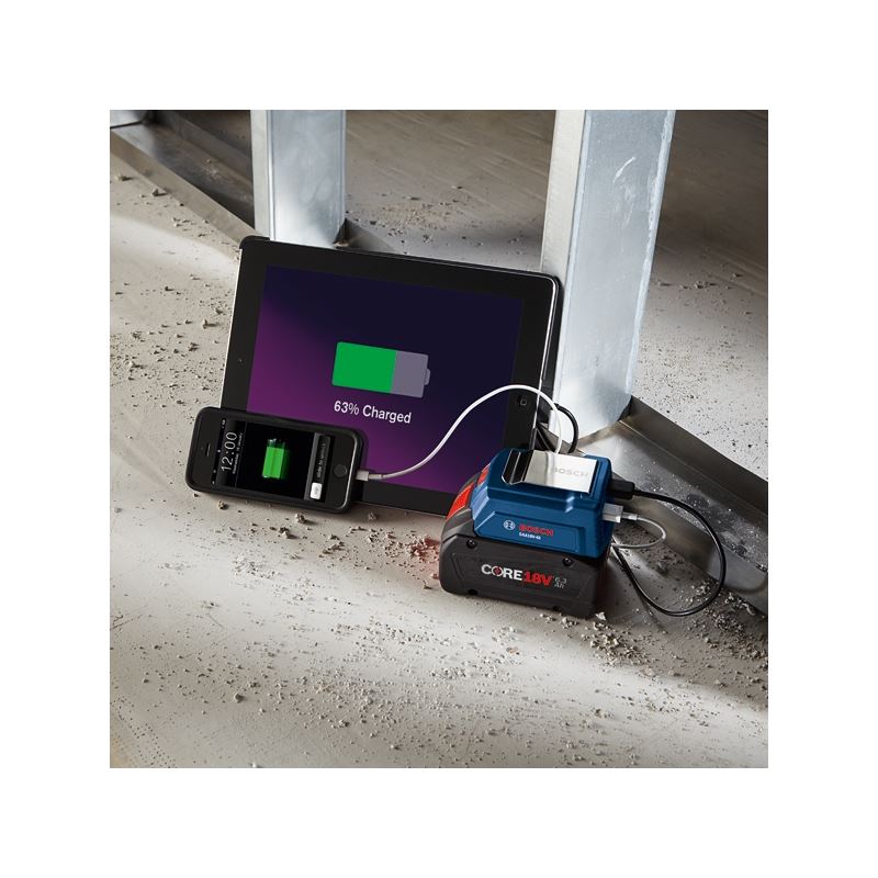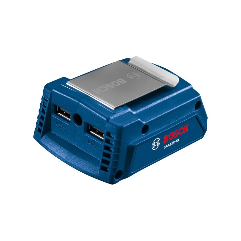 The Bosch GAA18V-48 18V USB Portable Power Adapter helps users quickly power up their other important tools - phones, tablets, and more - anywhere on the jobsite using an 18V Bosch Lithium-ion battery. The GAA18V-48 USB power adapter works with Bosch 18V Li-ion batteries delivering power to any 5V USB or 12V DC device(s), and is capable of charging two devices simultaneously. It is designed to withstand jobsite conditions and keep working. The output on this charger is 4.8 Amps, enough power to get mobile devices ready in a hurry. When simultaneously charging two devices, each output is 2.4 Amps Plus, the Bosch Portable Power adapter includes a port compatible with Bosch heated workwear, enabling users to stay warm during long cold days. The charger adapts to the device being charged, allowing for optimal charging current. while preventing overcharging by entering sleep mode once charging is complete. A metal belt clip is also included for additional storage and transportation convenience.