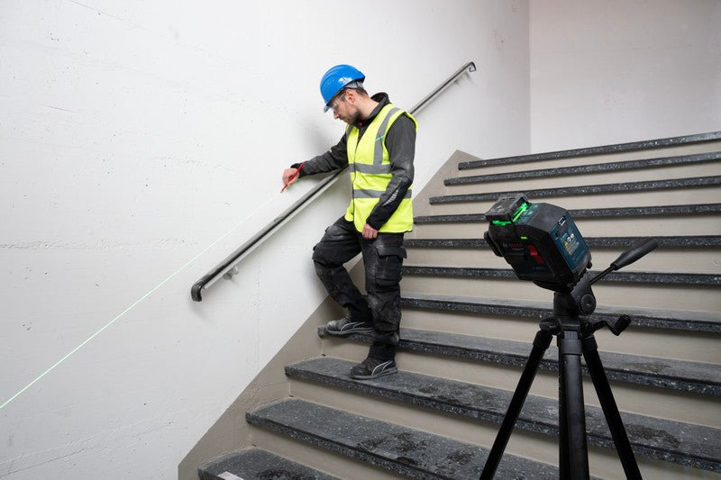 The Bosch GLL300-42GL 3.7V 360º Green-Beam Three-Plane Leveling and Alignment Laser provides an all-in-one level and alignment solution with incredible power flexibility. Versatile power options help maximize productivity and keep the laser up and running, with the ability to use with the included rechargeable 3.7V Li-Ion 3.0 Ah battery, AA batteries (sold separately) or even use while charging with the included USB-C cord. Built-in VisiMax™ technology optimizes line visibility for working conditions to further enhance accuracy and battery life. The leveling laser emits three bright green-beam laser chalk lines in 360° laser planes – one horizontal and two vertical for high-visibility and fast, streamlined job setup from one initial point. Full rubber overmold housing helps protect the level at every major impact point. IP65-rated, the laser can withstand tough, rainy conditions and is dust-tight for enhanced protection. The laser has a working range of up to 100 Ft., and the bright, vivid, thin lines provide an accuracy of 1/8 In. at 30 Ft. Further extend the range to 260 Ft. (measured at the horizontal line at 135º and 315º) with the level’s receiver compatibility (sold separately). Equipped with a Smart Pendulum System, the tool self-levels, will indicate any out-of-level condition and then locks when switched off for secure transport. Power-saving mode and brightness adjustment options help maximize runtime and battery life. Keep a handle on the laser with the rubber grip base and easily position using the ¼ In. and 5/8 In. threading mounts.