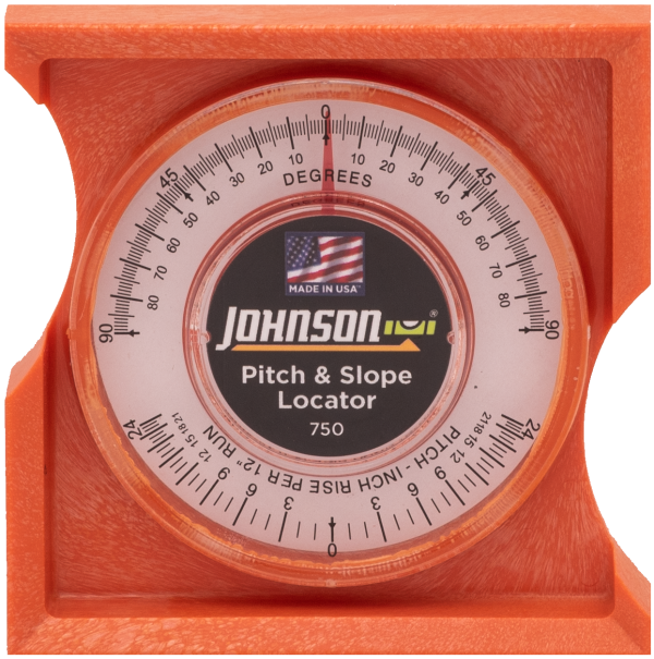 Measuring on the jobsite is a snap with Johnson's pitch and slope locator. It features a high-impact molded body for durability. Easy to read increments show 0-90° in two quadrants and inches per foot in the other two. Just flip the tool over to change the units you're reading. This pitch and slope locator is a must-have for craftsmen, general contractors and homeowners. It is particularly well suited for plumbing, drainage piping, electrical and HVAC work, or anything requiring accurate pitch or slope readings such as roof pitch and stair slopes.