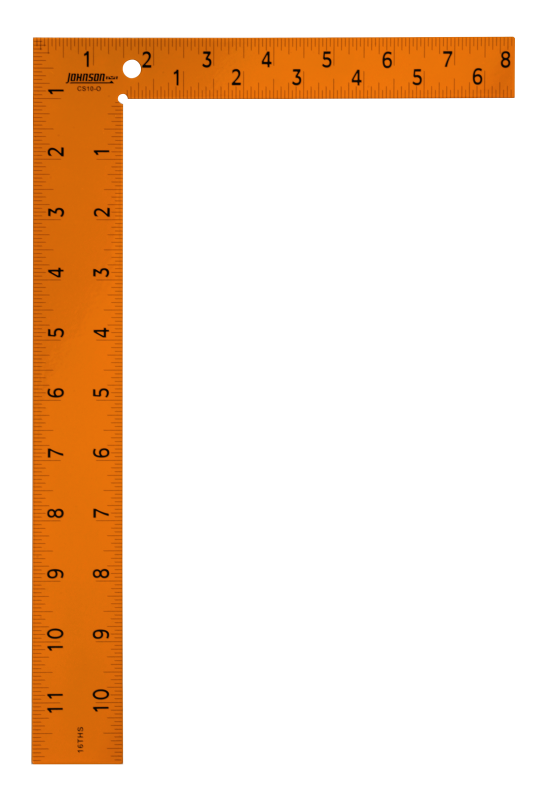 Johnson's 8" x 12" hi-visibility orange carpenter square features EZ Read™ numbers and graduations. Its rugged steel construction makes the square durable enough to withstand even the worst jobsite abuse. This carpenter square is ideal for remodelers and carpenters. It is a handy tool for laying out and marking patterns in framing, roofing, stairway work and more!