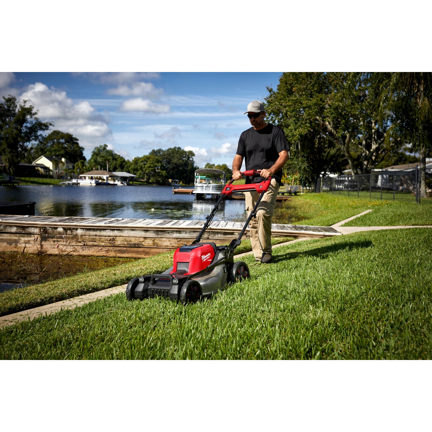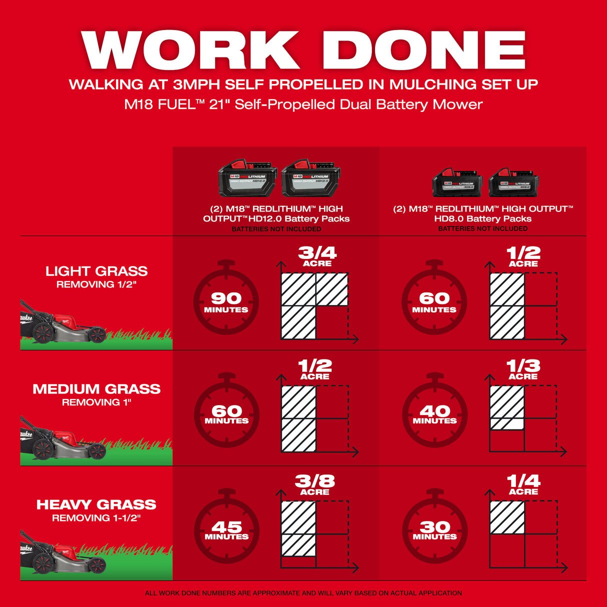 Our M18 FUEL™ 21" Self-Propelled Dual Battery Mower meets the performance, durability, and ergonomic needs of landscape maintenance professionals. The optimized steel deck design paired with higher blade speed allows our cordless electric lawn mower to achieve superior airflow and increased lift to deliver the best cut quality in mulching, bagging, and side discharge applications. The POWERSTATE™ Brushless Motor delivers more max torque than 200cc gas to take on the most demanding mowing applications. The REDLINK PLUS™ Intelligence has total system communication between the tool and battery for unmatched levels of performance, protection, and productivity. The advanced electronic package also delivers an instant throttle response on both the blade and drive motors to reach full throttle in under 1 second, which increases your control and productivity. The electric mower requires 2 M18™ REDLITHIUM™ Batteries for operation. When paired with the recommended 2 M18™ REDLITHIUM™ HIGH OUTPUT™ HD12.0 batteries (not included), the self-propelled electric lawn mower delivers up to 60 minutes of runtime, allowing up to 1/2 acre of cutting when removing 1" of grass at a 3 MPH self-propelled pace. The Variable Speed Self-Propelled Mower offers speeds between 0 - 4 MPH, and the Active Speed Management Paddles allow you to easily adjust your walking pace while in operation to increase control. The M18 FUEL™ Mower features a steel deck, 3-in-1 grass management, single point height adjustment, high lift mode, front & side LED lights, vertical storage, and two deck handles. The M18 FUEL™ 21" Self-Propelled Dual Battery Mower is part of the M18™ System, fully compatible with over 250 solutions.
