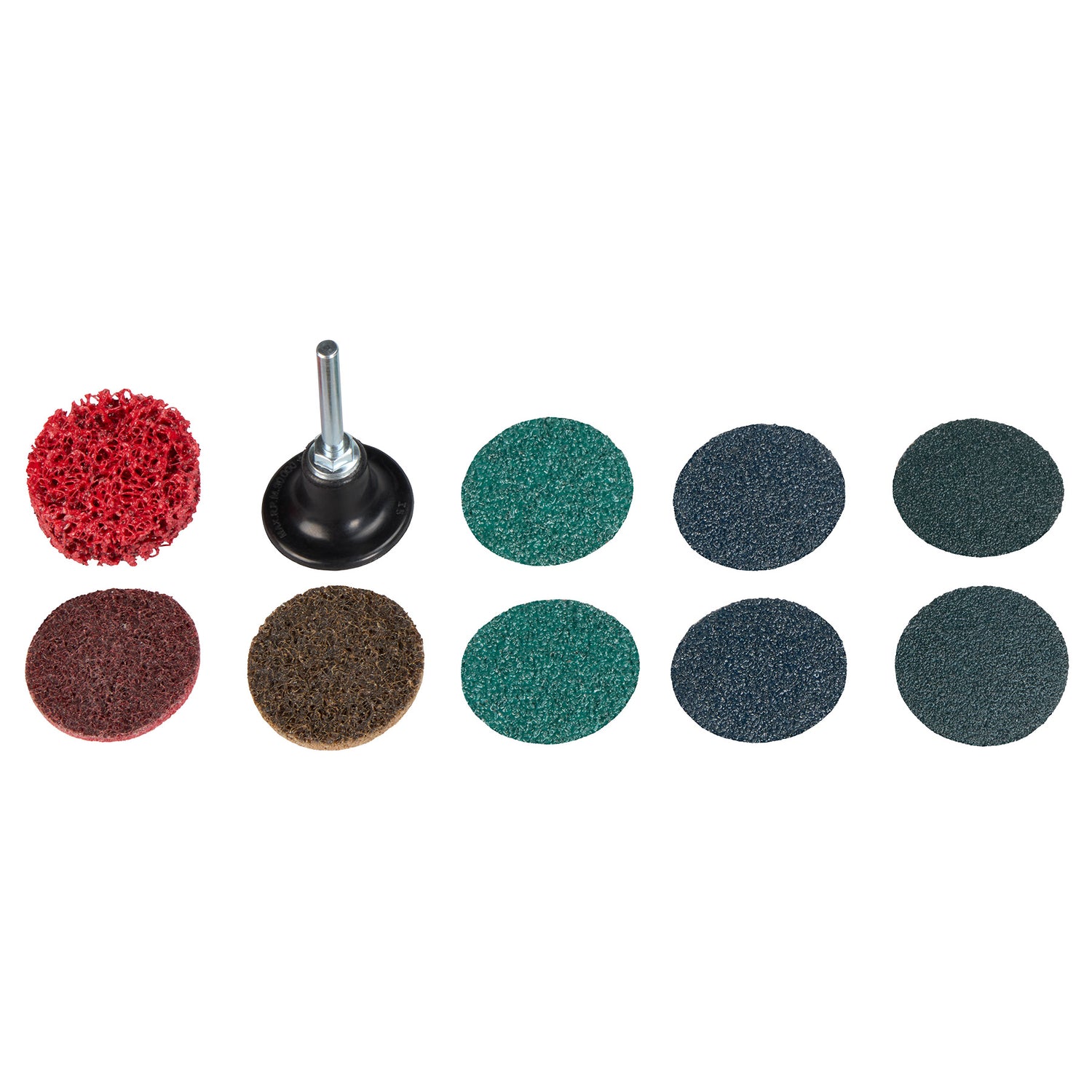 Kit includes: (2) 24 Grit Sanding Discs, (2) 36 Grit Sanding Discs, (2) 50 Grit Sanding Discs, (1) Medium Grade Surface Conditioning Disc, (1) Course Grade Surface Conditioning Disc, (1) Paint Removal Disc, (1) Universal ¼” Arbor w/ Quick Change Backer Pad